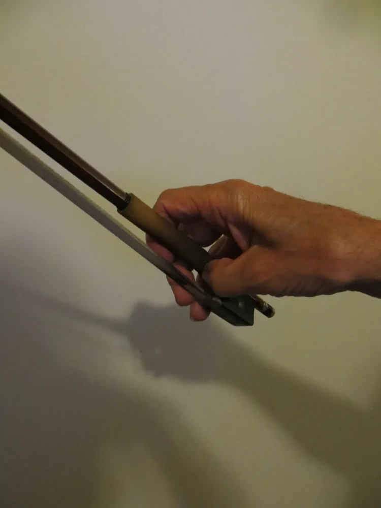 Increased weight is essential for big passages, especially as the bow gets closer to the bridge, but this weight can be added by pulling down (see photo 10) rather than pushing. Pushing creates a significant strain on the elbow and can easily lead to a tendonitis that may take a long time to heal.
